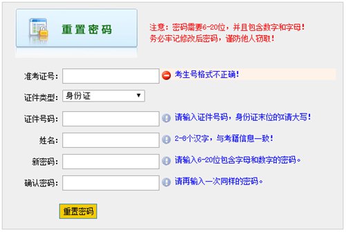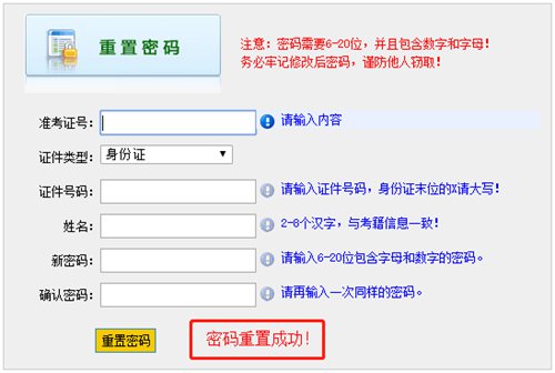 按要求输入准考证号、证件号码、姓名和新密码后点击重置密码按钮。